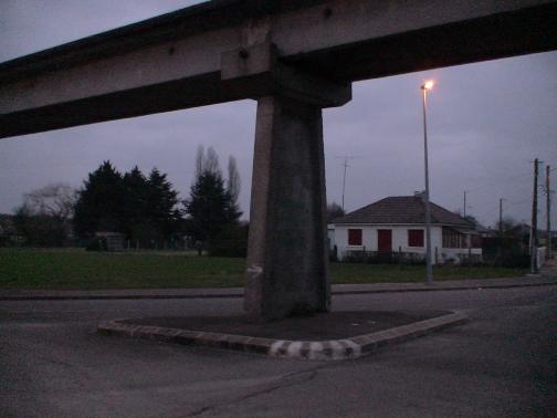 Ceci est la preuve de la complète intégration du rail d'aérotrain aux zones urbaines. Le poteau s'inscrit très sobrement dans un haricot de la voirie.